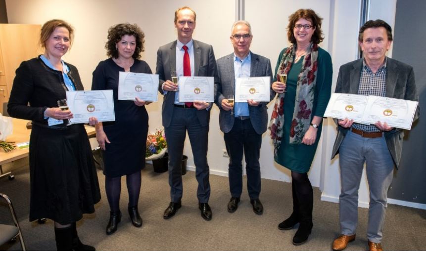 Wethouder Gezondheid, Miriam Haagh (tweede van rechts) overhandigt die dag, samen met Milieuplatform Zorg, het officiële certificaat aan de bestuurders van de zorginstellingen. V.l.n.r: Roos Leber (Amphia), Monica Kuijs (Park Zuiderhout), Albert-Jan Mante (Revant), Anthonie Maranus (Surplus), Miriam Haagh (Gemeente Breda) en Gert van der Pluijm (Raffy en de Leystroom)